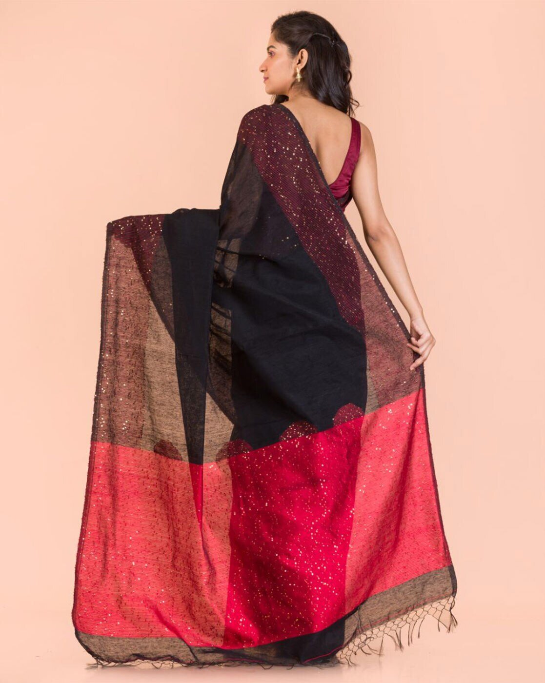 - The last image gives a detailed look of the blouse piece that comes with this saree (The model is wearing a blouse from our in-house wardrobe)