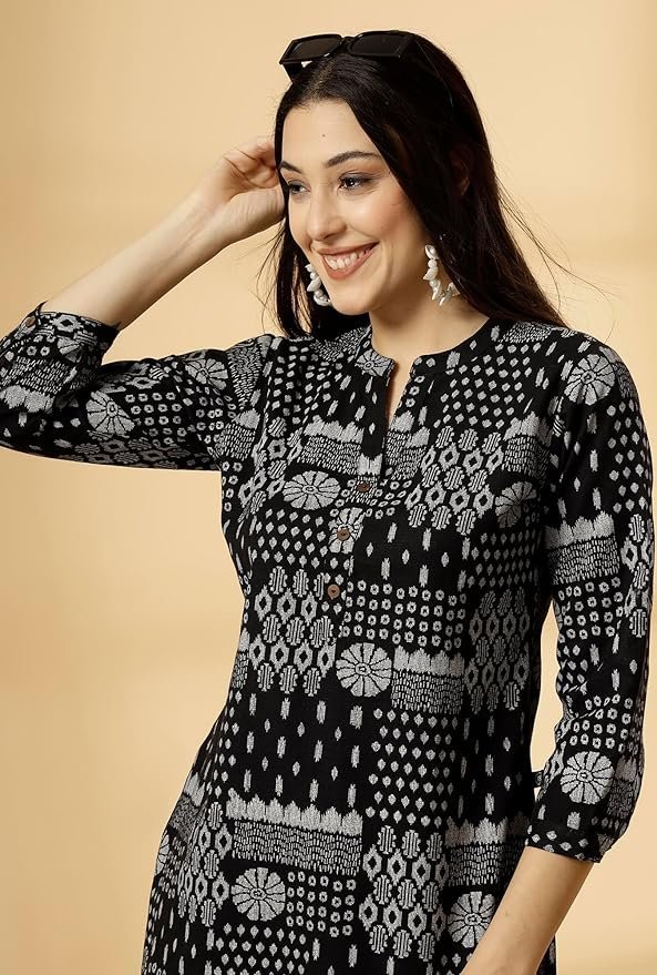 Polyester Women's Floral Placement 3/4 Sleeve and Keyhole Neck Printed Short Kurti